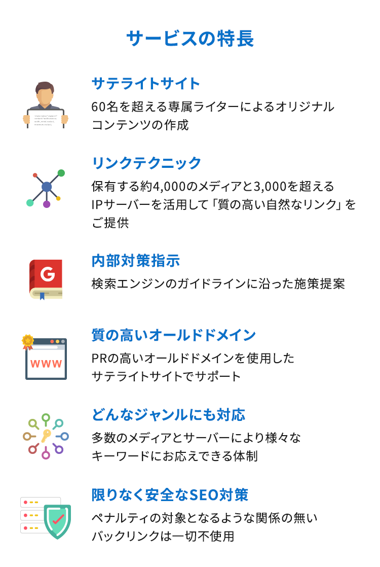 磨きをかけた質の高いリンクで検索エンジン最適化を行い、検索順位の上位を目指します。