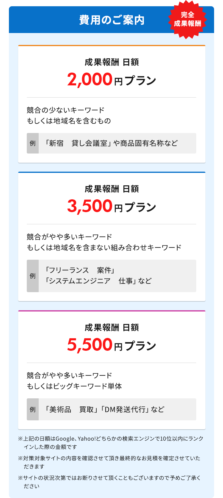 1位~10位に表示されて、初めて料金が発生する完全成果報酬型SEOサービスです。