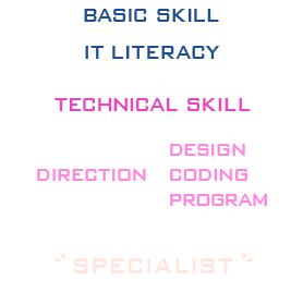 ベーシックスキルと共に、WEB制作の基盤をさらに築くため、幅広い職種のテクニカルスキルを上げます。